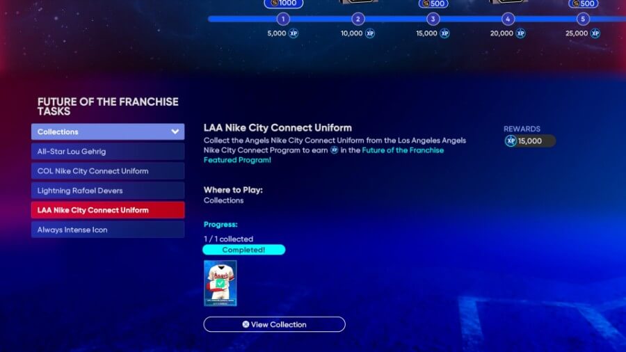 目前对于特许经营计划的未来,有五个项目需要收集: 全明星卢格里格 来自 Lou Gehrig Day 计划; 落基山脉和天使队的 Nike City Connect 制服 从他们的相关程序中; 闪电拉斐尔·德弗斯 来自五月月度奖励计划; 和 总是强烈的图标 来自 Always Intense 计划。 将它们添加到主程序集合以解锁体验。