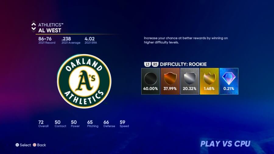 如果您只想与 CPU 玩游戏,那很好! 您仍然可以为您玩的每个游戏赚取经验,但如果不添加收藏或玩任务,速度会明显变慢。 尽管如此,为了让您的游戏更轻松,在与 CPU 对战时, 尽可能玩新手难度. 更好的是,与奥克兰、辛辛那提和巴尔的摩等较弱的球队比赛。 毕竟,你玩得越好,你获得的经验就越多。