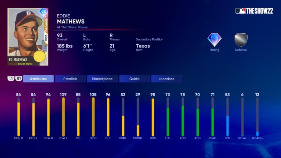 Mathews 是一位出色的球员,具有高接触和力量。 他不是最快的球员,但他确实有坚实的防守。 作为一名三垒手,防守等级比他的速度更重要。 不幸的是,马修斯没有次要职位。