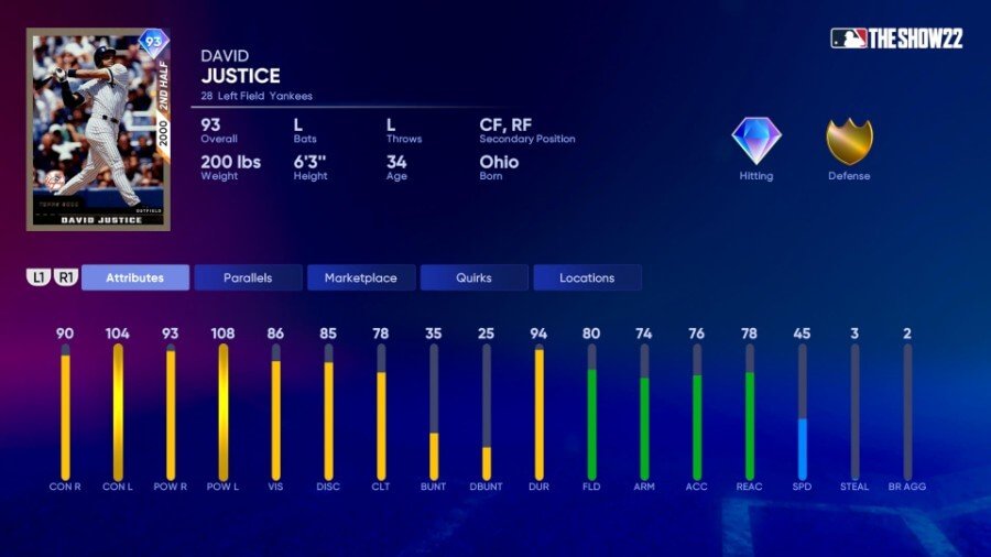 最后是 2000 年从克利夫兰交易到纽约后的大卫·贾斯蒂斯,他所做的只是将球捣碎。 左撇子是一个非常平衡的击球手,他的最低接触或功率等级为 90,最高为 108。他是三个位置球员中最慢的,但他确实拥有与马修斯相似的稳固防守。 正义可以打所有三个外场位置。
