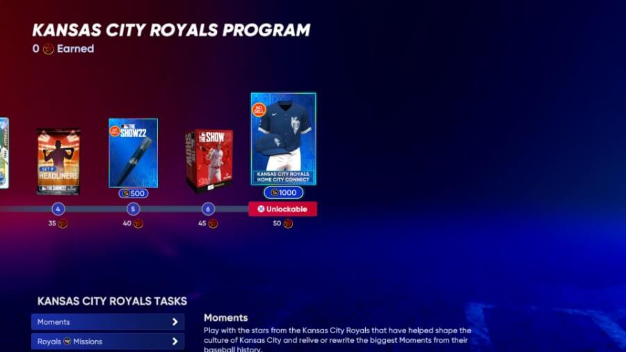 还有一个新的 City Connect 球衣计划,这次是堪萨斯城最近公布了他们的 City Connects。 你必须获得 50个节目明星 解锁 City Connect。 先完成时刻,然后完成任务。