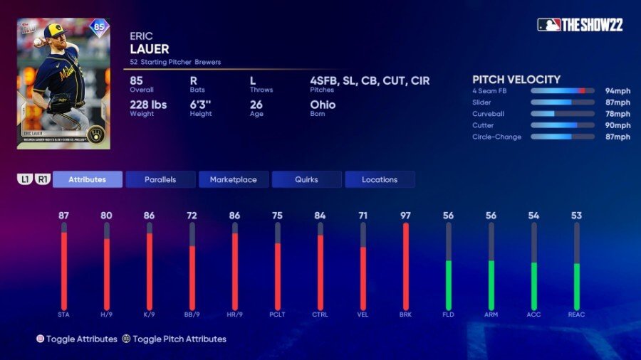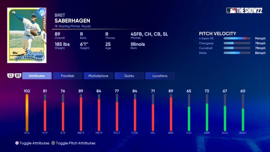 您将在 30 位节目明星中解锁老将 Bret Saberhagen,然后他将成为更多节目明星任务的一部分。 89 位 OVR 右撇子具有出色的耐力 (102)、每 9 局的步行次数 (89) 和投球突破 (89)。 尤其是 Saberhagen 的曲线球和滑块,它们有很多动作。