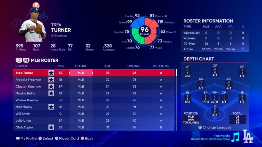 著名击球手: Trea Turner(94 OVR),Freddie Freeman(93 OVR),Mookie Betts(92 OVR)