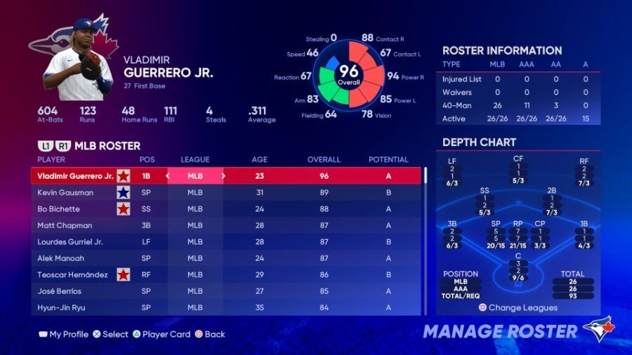 著名击球手: Vladimir Guerrero, Jr. (OVR 96), Bo Bichette (OVR 88), Teoscar Hernandez (OVR 86)