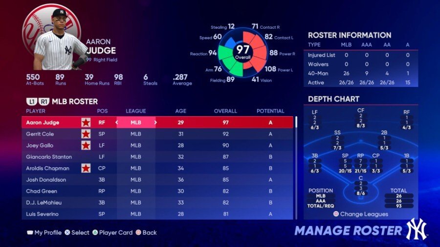 美国职业棒球大联盟中最好的本垒打球队之一——部分得益于洋基体育场的规模——洋基队拥有三名强力击球手,可以将任何错误变成一个漫长而高耸的本垒打。 Aaron Judge (97 OVR) 在 The Show 22 中对左撇子的实力确实被压倒了。 Joey Gallo (89) 的额定功率分别为 97 和 99,而 Giancarlo Stanton (87 OVR) 也将两者混为一谈,但比其他两个具有更好的接触评级. 这三个人最大的问题是他们都有平庸到微不足道的板视觉,所以他们有很多摇摆不定的地方。