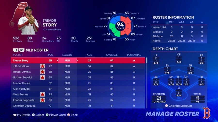 著名击球手: Trevor Story (94 OVR), JD Martinez (87 OVR), Rafael Devers (86 OVR)