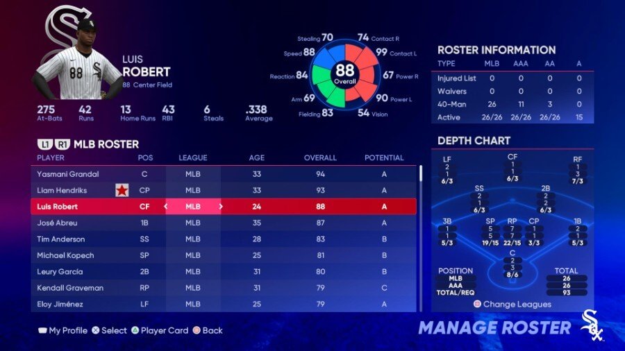 著名击球手: Yasmani Grandal (94 OVR), Luis Robert (88 OVR0, José Abreu (87 OVR)