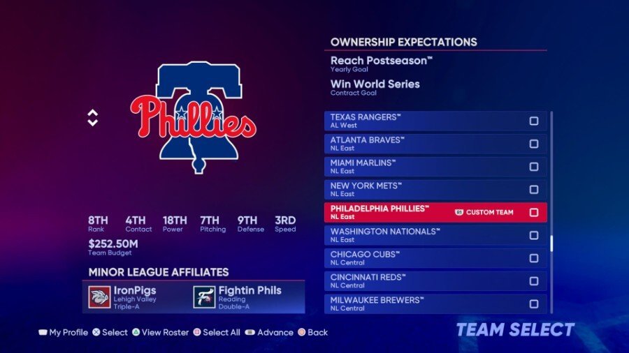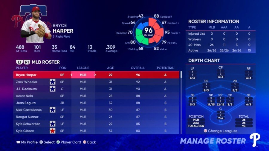 著名击球手: 布莱斯哈珀 (96 OVR), JT Realmuto (90 OVR), 凯尔施瓦伯 (85 OVR)