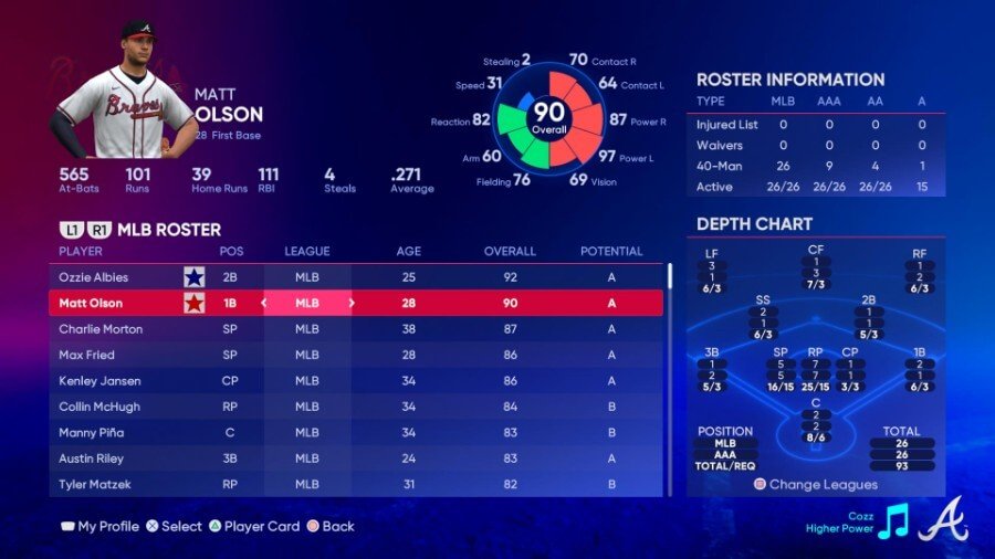 著名击球手: Ozzie Albies(92 OVR),Matt Olson(90 OVR),Austin Riley(83 OVR)