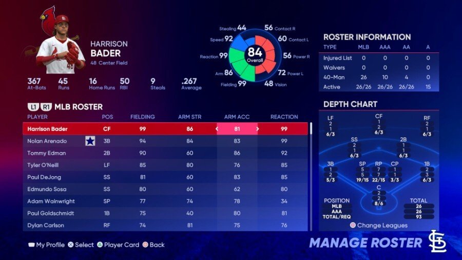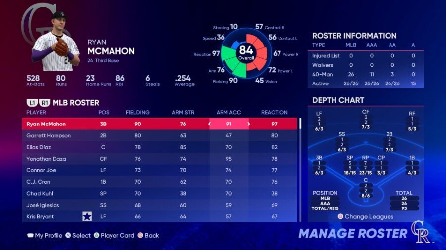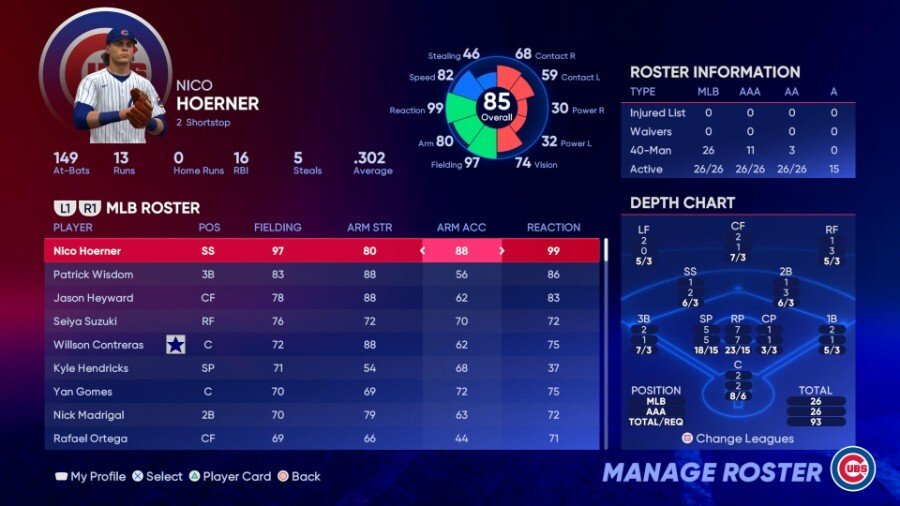 著名的守场员: Nico Hoerner(99 反应)、Patrick Wisdom(88 臂力)、Jason Heyward(88 臂力)