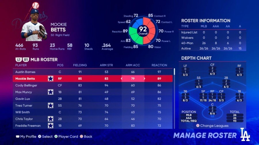 著名的守场员: Austin Barnes(97 反应)、Mookie Betts(89 反应)、Cody Bellinger(94 臂力)