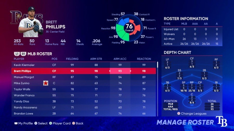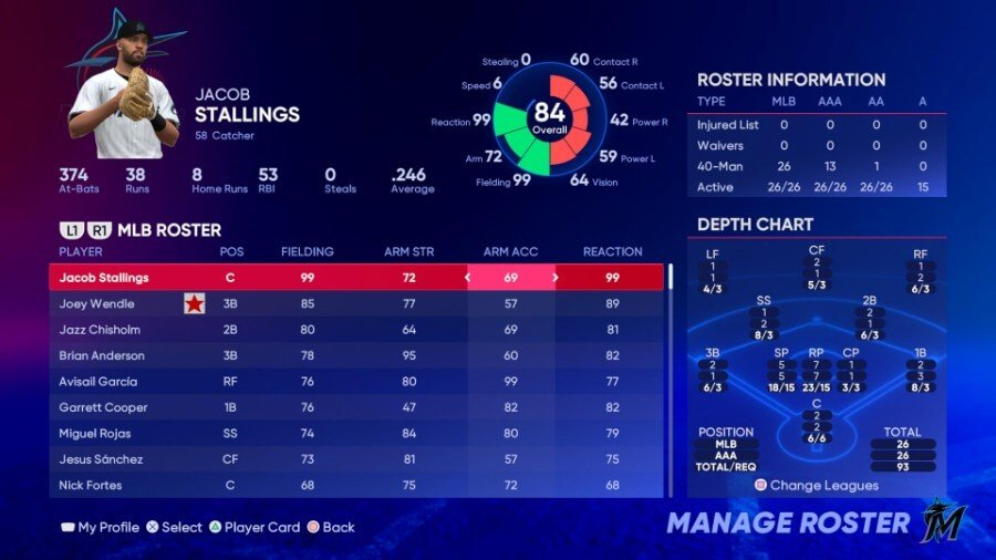 迈阿密队增加了一名球员:接球手雅各布斯托林斯,在与匹兹堡的交易中获得了巨大的防守。 Stallings 在 2021 年的职位上同时获得了金手套奖和菲尔丁圣经奖,并在 The Show 22 中的收视率表明了这一点。 他的盖帽在 80 岁时也很出色。他与多才多艺的后卫前 Ray Joey Wendle 和令人兴奋的 Jazz Chisholm, Jr. 一起在二垒。 另一位全能后卫布莱恩·安德森(Brian Anderson)拥有强壮的(如果不准确的话)手臂,而 Avisail García 和 Jesus Sánchez 则在外场围攻。 加勒特库珀在一垒很稳定,尽管他的手臂力量很微薄(47)。 再说一次,一垒手不应该像其他内野手那样扔球。