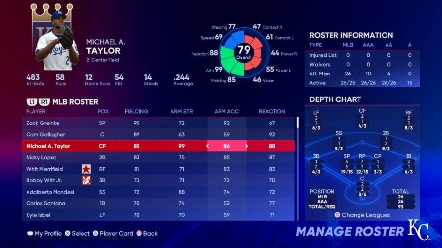 著名的守场员: Zack Greinke (95 Fielding), Cam Gallagher (92 Reaction), Michael A. Taylor (99 Arm Strength)