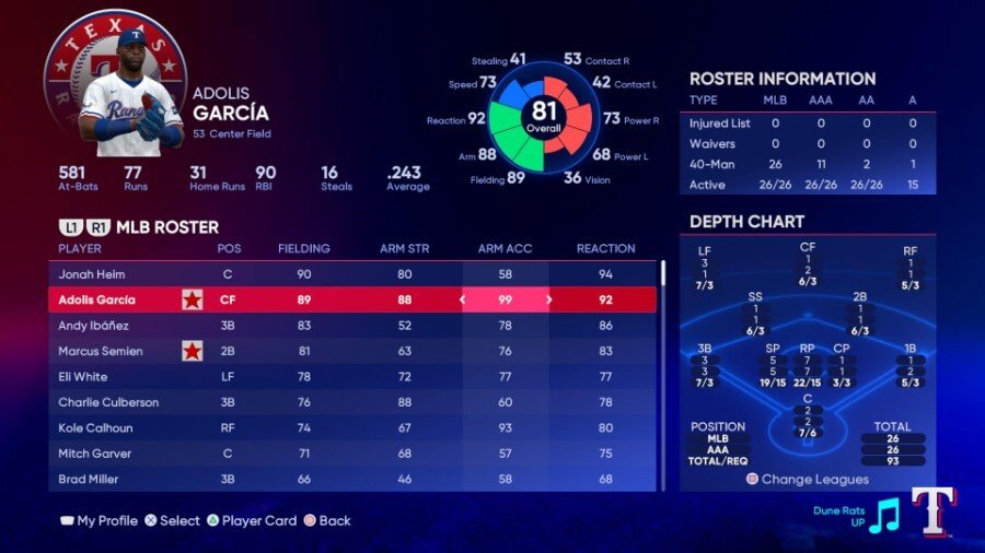 著名的守场员: Jonah Heim (94 Reaction), Adolis Garcia (99 Arm Accuracy), Andy Ibáñez (86 Reaction)