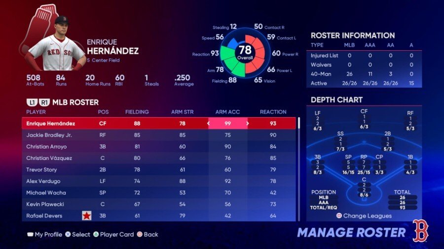 著名的守场员: Enrique Hernández (99 Arm 精度)、Jackie Bradley, Jr. (90 Reaction)、Christian Arroyo (90 Arm 精度)