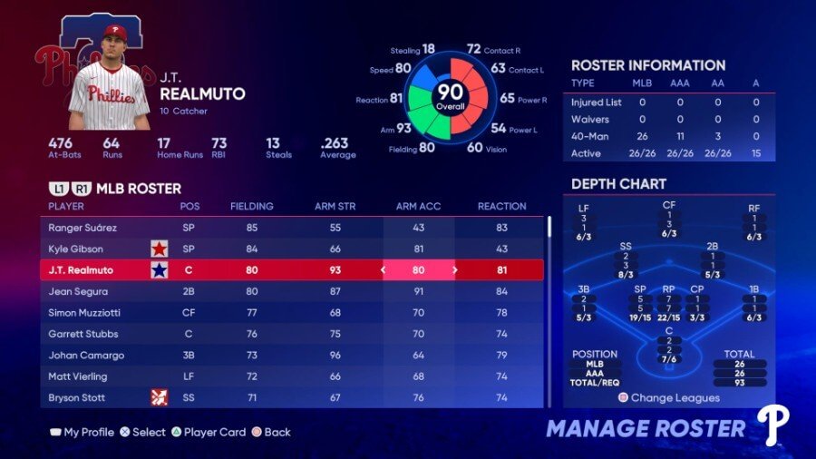 著名的守场员: Ranger Suárez (85 Fielding), JT Realmuto (93 Arm Strength), Jean Segura (91 Arm Accuracy)