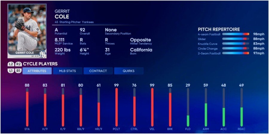 在投球方面,速度和投球离合器是一个危险的组合。 Gerrit Cole 两人的得分都达到了 99。 这将使您在 3-2 计数或比赛后期情况下更好地控制您的投球。 他的 99 Velocity 让他能够投出 98 mph 的快球和 83 mph 的曲线球。