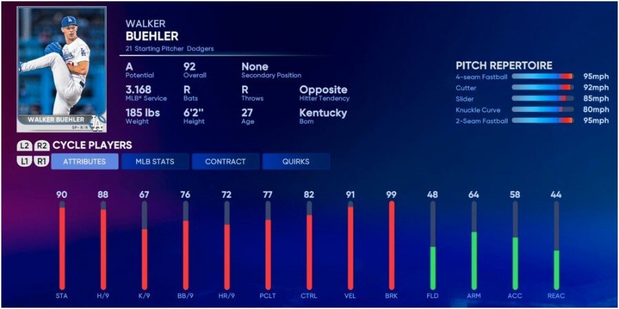 沃克·比勒 (Walker Buehler) 即将迎来 2021 年全明星赛季,距离帮助洛杉矶道奇队赢得 2020 年世界大赛只有两年时间。 Buehler 有一个切刀、滑块和指关节曲线作为音高类型,因此他的 99 Pitch Break 评级使他的音高几乎无法阅读。