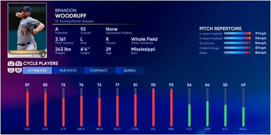 Brandon Woodruff 在两个非常关键的投球类别中得分 90+:95 Velocity 93 Pitch Break。 这对击球手来说是危险的,因为他会以 84 英里/小时的速度 12-6 弯道,当如此快速地冲向你并同时破门时,这并不容易定位。 他有 81 投球控制,这意味着他很少投出疯狂的投球。