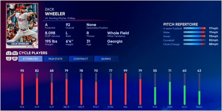 Zack Wheeler 的天赋让他能够制定出在大多数情况下都能奏效的策略。 该策略是尽可能快地投掷。 他拥有惊人的 99 速度和 95 耐力。 他没有给你足够的时间看球破门。