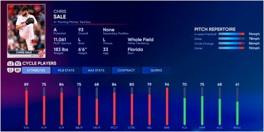 塞尔的投球类型具有一定程度的欺骗性,因为他的快球和坠子除了在他的身体上投球外只有两英里/小时的差异。 他的 Pitch Break 属性是 86,因此很难预测它是否是一个破球。 Sale 的音高控制也很出色,在该类别中得分 80。 后期比赛情况对他来说也没有问题,因为他有 89 的耐力和 84 投手离合器。 克里斯·塞尔在 2021 赛季赢得了 5 场比赛、3.16 次自责分率和 52 次三振出局。