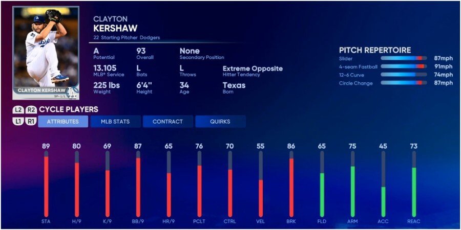 由于 2021 年伤病困扰,克莱顿·克肖今年受到了一些打击。他的球员卡并没有以 90+ 的评分跳出来,但他具有全面的精英属性。 Kershaw 在比赛初期不会疲倦(89 耐力)。 他在每九局不允许安打和保送方面表现出色(分别为 80 和 87 次),同时还在同一跨度内击出了很多击球手(每 9 局三振出局 69 次)。