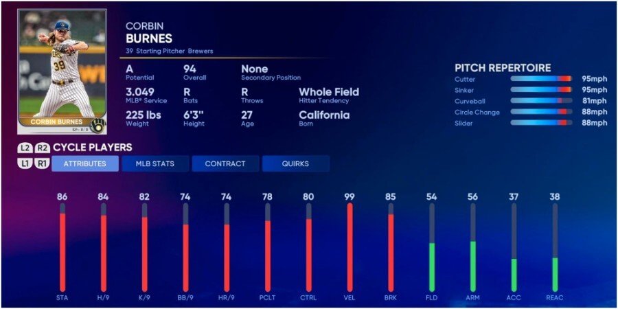 Corbin Burnes 应该被用作 Sonic 2 的交叉宣传工具,因为这家伙只知道速度。 他所有的投球速度都是 80 英里/小时或更快,包括突破和超速投球。 他的 Pitch Break 属性为 85,在 Pitch Control 中得分为 80。 伯恩斯的投球速度很快,很狡猾,而且很有权威。 他也是Road to the Show中Break原型的特色球员。