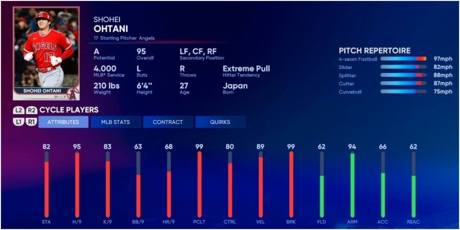 Ohtani 在 90 年代拥有三个属性,包括在 99 时将投球离合器和 Pitch Break 类别最大化。他投出的速度为 97 英里/小时的快球,许多人无法击中,这就是为什么他在每九局的安打中也拥有 95 分的原因。 在这件事上,你不能要求一个更好的双向球员或棒球运动员。 Ohtani 赢了 9 场比赛,ERA 为 3.18,击出 156 名击球手。