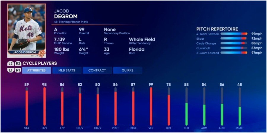 deGrom的最低属性是78(Pitch Break),但大部分都在80高。 德格罗姆不仅是一名精英投手,而且他是百分之一中的百分之一。 他对自己的投球有很好的控制(87 Pitch Control),他是一名出色的关键球员(86 Pitching Clutch(,并且可以投出完整的比赛(89 Stamina)。他是棒球界最好的投手——当他健康时,他现在是不是在 2022 年。尽管伤病缠身,但德格罗姆在 2021 年赢得了 7 场比赛,并有 1.08 次自责分率和 146 次三振出局。