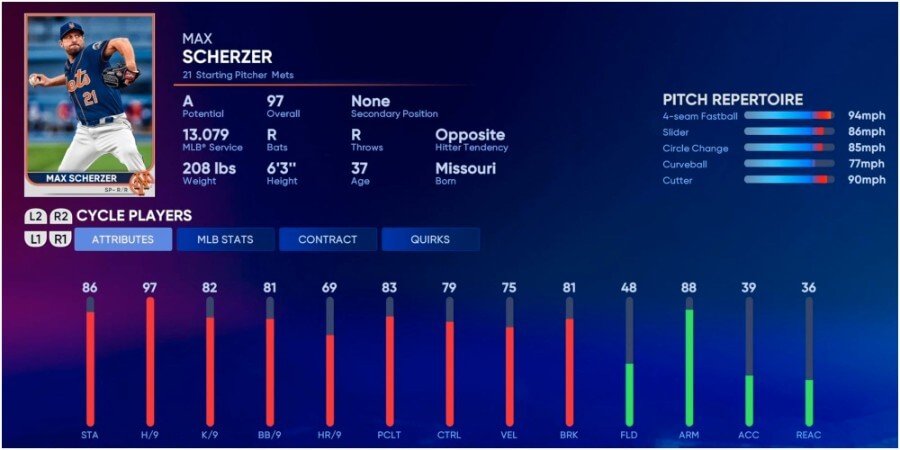 Scherzer 的 86 耐力意味着他可以投出完整的比赛并在整个比赛中发挥精英水平。 他没有弱点,他的大部分属性得分都在80年代,这表明他是一个真正的投手。 在 2021 赛季,舍尔泽赢了 15 场比赛,自责分率为 2.46,击出 236 次击球手。