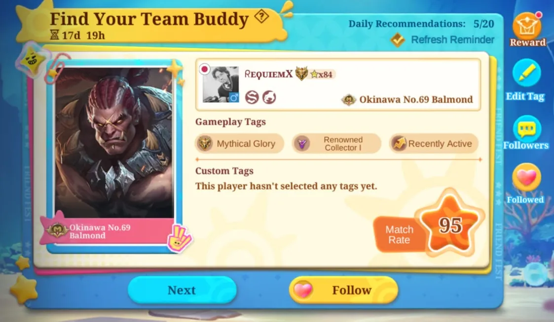 恭喜!凭借这一新的社交功能,MLBB 终于名副其实地被称为 Hinge,玩家可以随机挑选陌生人帐户并关注他们。您可以按“下一步”按钮转到下一个人,但请记住,每日推荐的数量上限为 20 条。