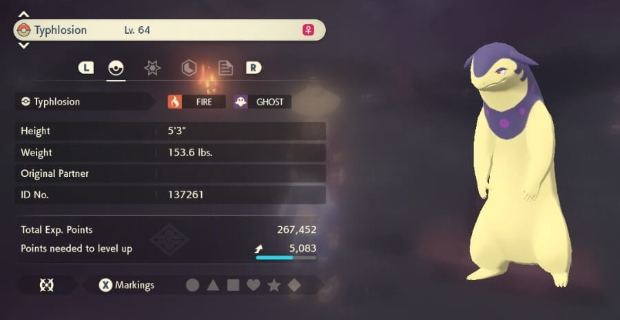 Hisuian Typhlosion是Cyndaquil最终进化的Hisuian独有形式。 与纯火系的未来城都版本不同,Hisuian Typhlosion 是火系和幽灵系,基础统计总数略有不同。 Hisuian Typhlosion 拥有相同的 534 点,但牺牲了一点速度和生命值,以获得更大的特殊攻击 (119) 提升。 这有助于利用这两种类型的许多特殊攻击,例如火焰喷射器和暗影球。