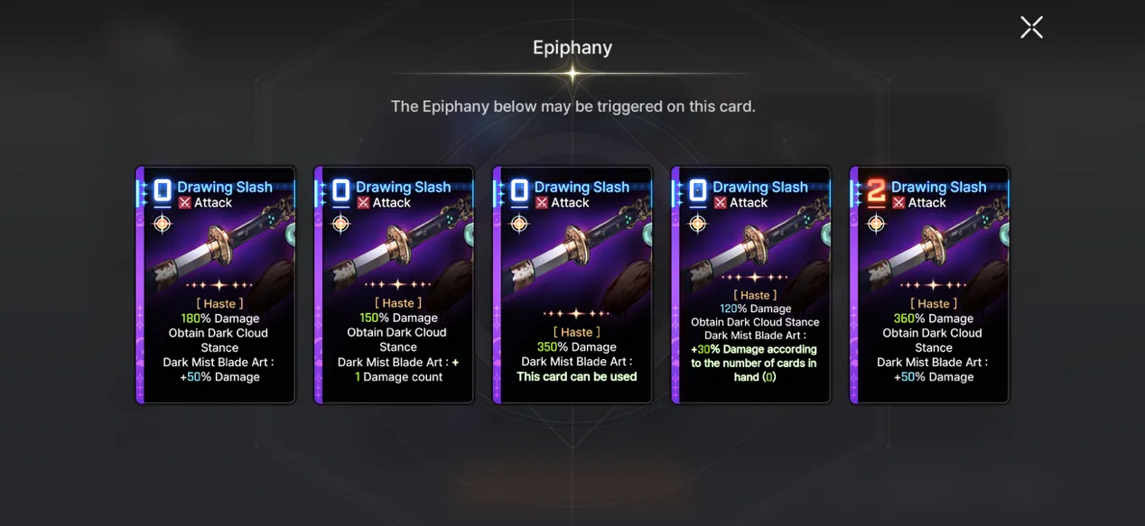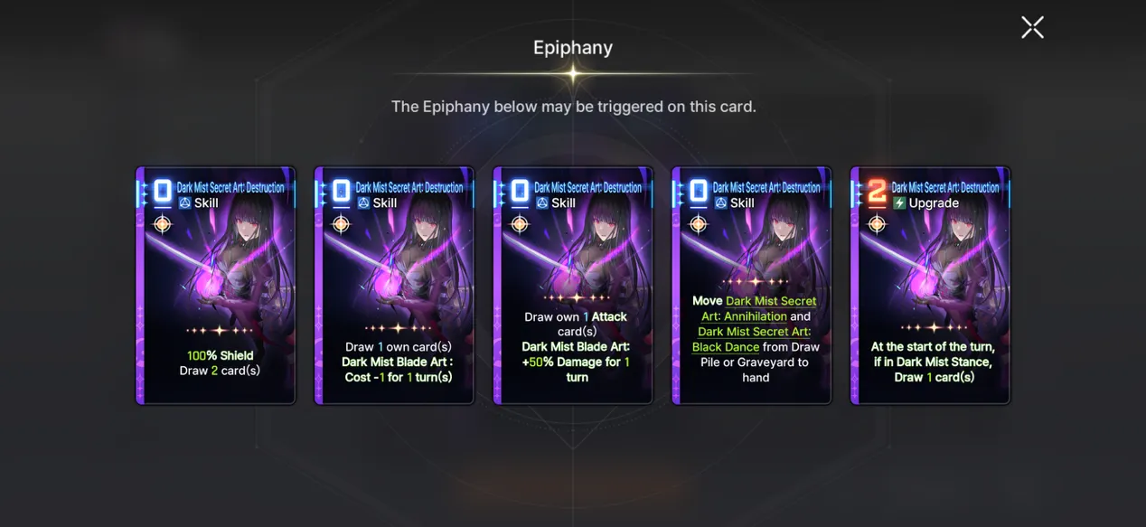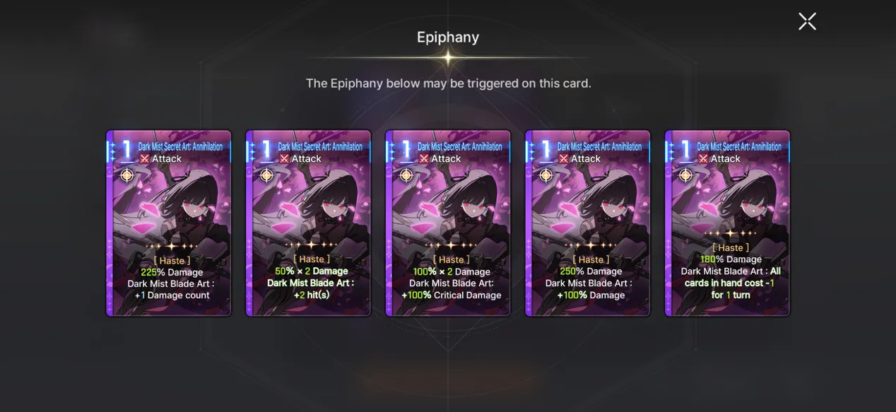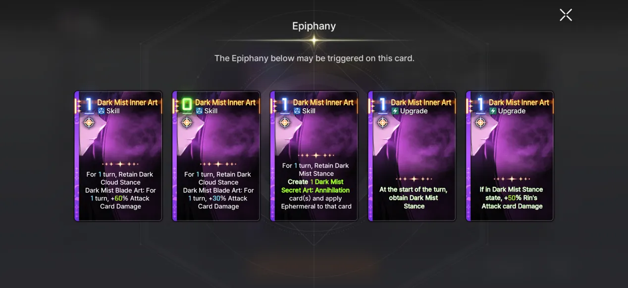 • 暗雾诀:黑舞(1费攻击):80%伤害。根据手中技能卡的数量获得额外攻击力(最多 5 次)。凛的主要爆发技能之一。