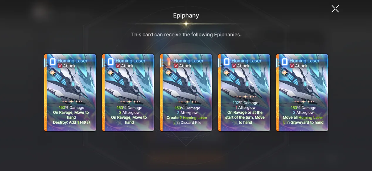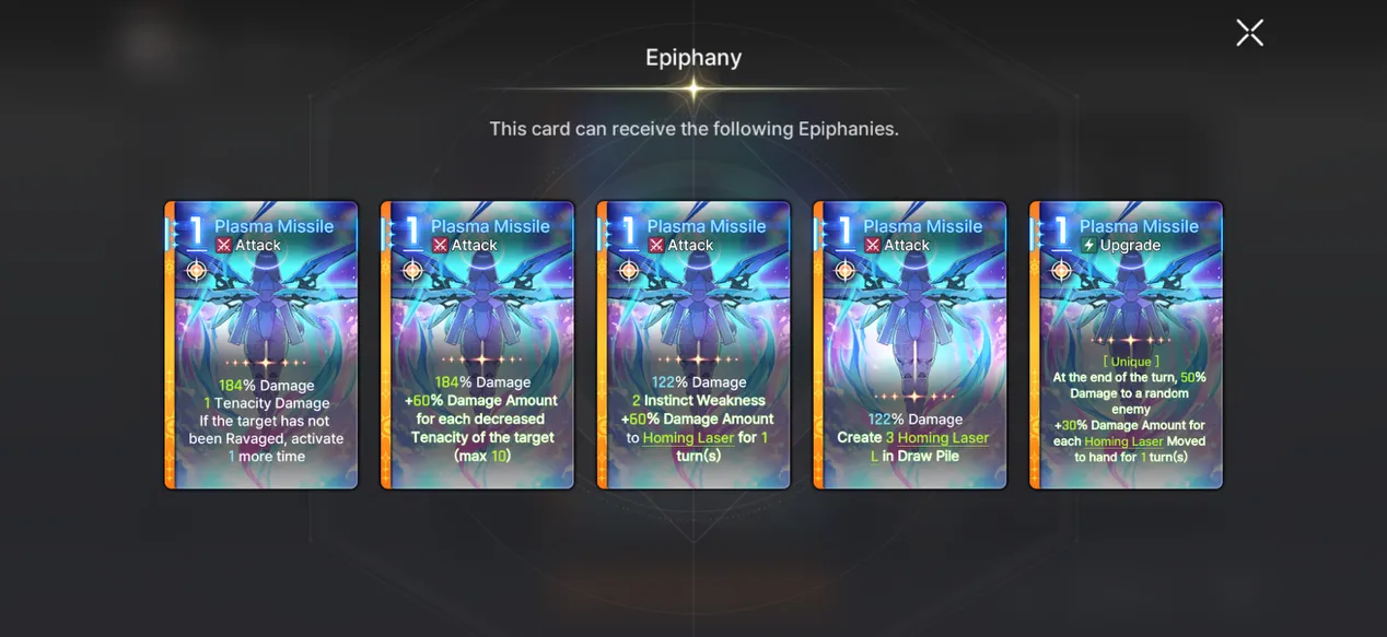 - 等离子导弹:一个不错的选择是顿悟“在回合结束时对随机敌人造成伤害,伤害根据手中的寻的激光而增加”,提供可靠的回合外伤害。或者,“在抽取堆中创建 3 个寻的激光 L”非常适合储存资源。