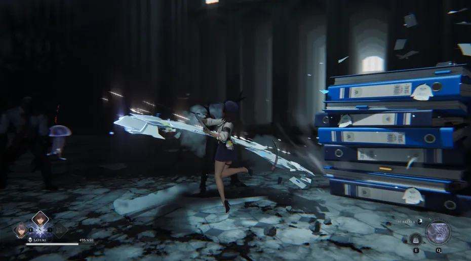 她的正常攻击包括使用手中的警察文件来造成物理伤害。当敌人被吸引并聚集在一起时,玩家不仅可以使用她的元素技能召唤大量文件来粉碎敌人,还可以激活她的元素爆发召唤出大量文件,释放出大范围的空爆。