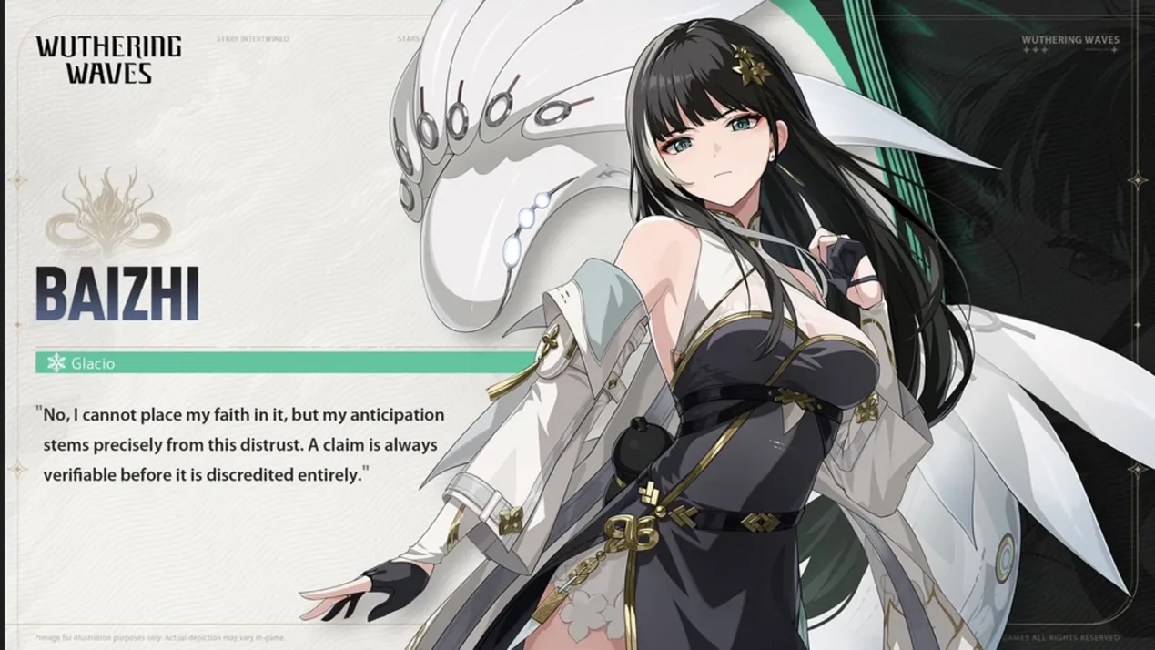 Baizhi 是一个免费的 4 星级 Glacio 突变体谐振器,充当 治疗者和缓冲者。她与她的同伴幽潭(一种类似白龙的生物)一起,专门致力于保持团队的持续发展,同时促进协奏曲的产生。作为最早的自由角色之一,她为所有玩家提供可靠的支持。